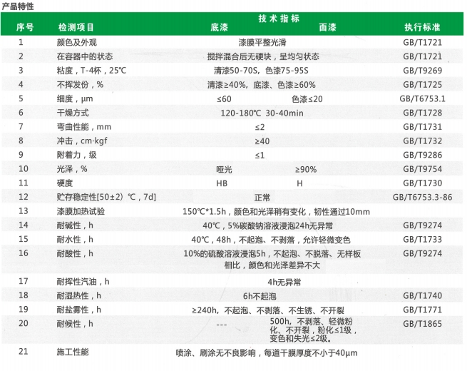 該產(chǎn)品由短油醇酸樹脂、熱固型丙烯酸樹脂.聚酯樹脂、氨基樹際、耐曬顏填料,高分子助劑及有機(jī)溶劑通過精心設(shè)計而成的單組份烘干型涂料。