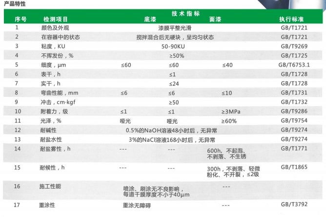 施工方式:采用輥涂。刷涂,噴涂方式操作均可;無不良影響,每道干膜厚度z40um理論涂布率:6-8m/KG(30-40um干膜厚度).3-4m/KG(60-80um干膜厚度)